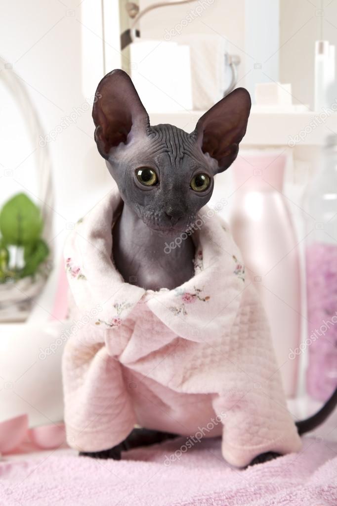 hairless cat wearing clothes